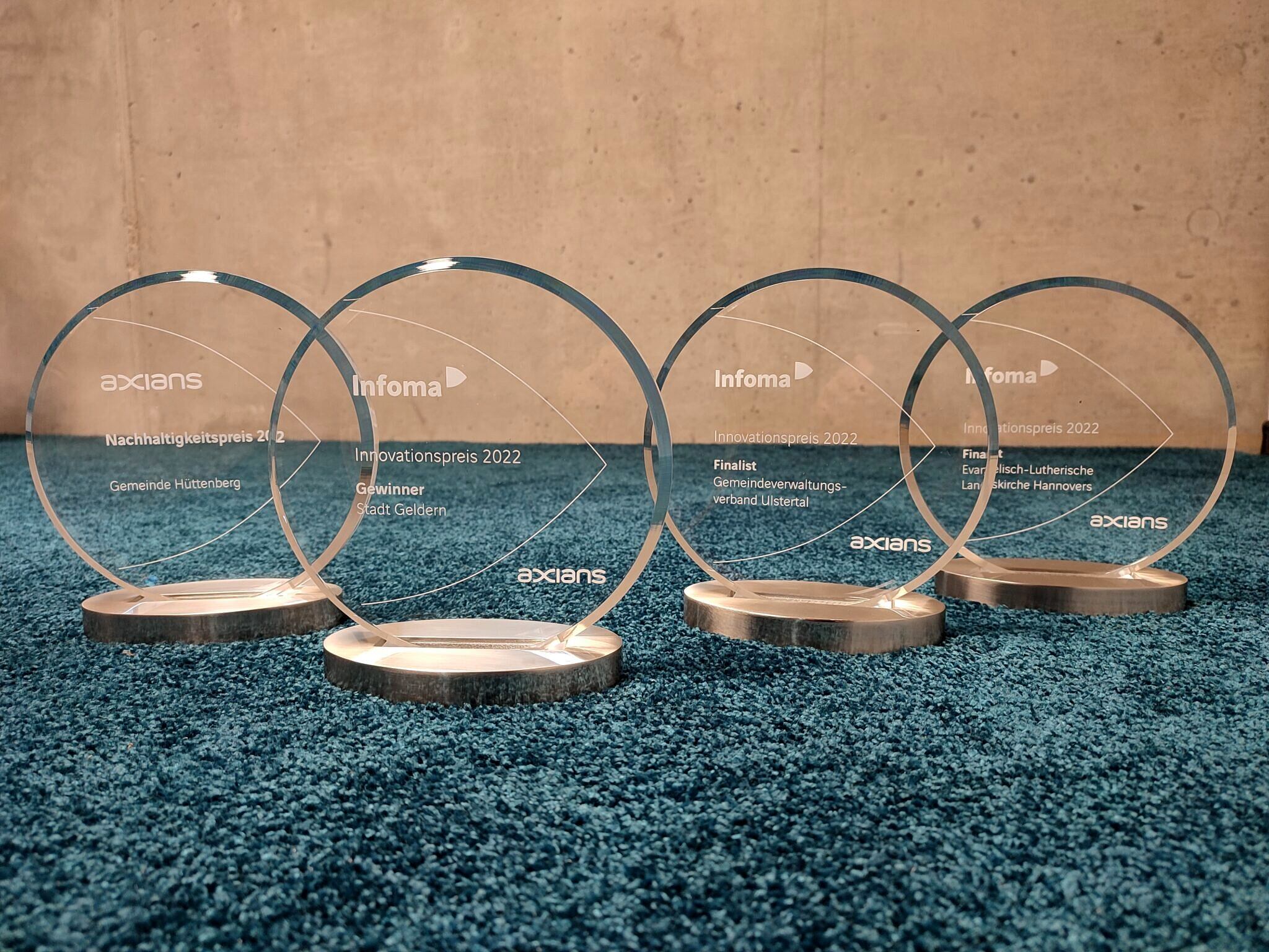 Jubiläum bei der Vergabe des Axians Infoma Innovationspreises: 2022 hat das Ulmer Software- und Dienstleistungsunternehmen zum zehnten Mal in Folge den Innovationspreis für vorbildliche, zukunftsorientierte kommunale Digitalisierungsprojekte auf Basis von Infoma verliehen. Als Gewinner des Wettbewerbs ging die nordrhein-westfälische Stadt Geldern hervor. Die Finalistenplätze belegten die Evangelisch-lutherische Landeskirche Hannovers sowie der hessische Gemeindeverwaltungsverband Ulstertal. Erstmalig gab es in diesem Jahr auch einen Nachhaltigkeitspreis, den die hessische Gemeinde Hüttenberg erhielt. Das mit den Auszeichnungen verbundene Preisgeld kommt selbstgewählten sozialen Zwecken zugute.