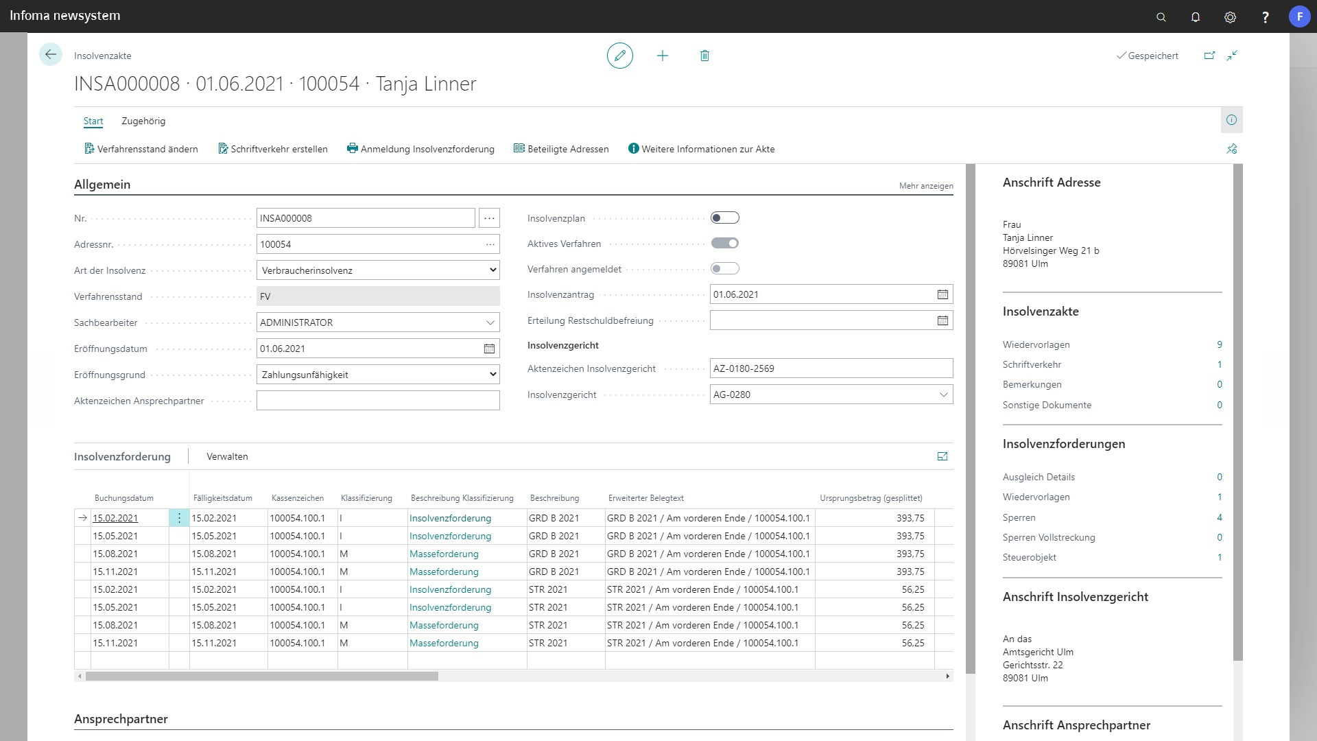 Ermöglicht zu jedem Insolvenzfall das Anlegen einer Insolvenzakte mit umfangreichen Stammdaten, um die Forderungsanmeldung vollständig und fristgerecht zu erstellen. Die Mahn-, Auszahlungs- und Vollstreckungssperren können automatisiert gesetzt werden. Dabei zieht die Insolvenzverwaltung den Vorteil aus der nahtlosen Integration in das Finanzwesen.