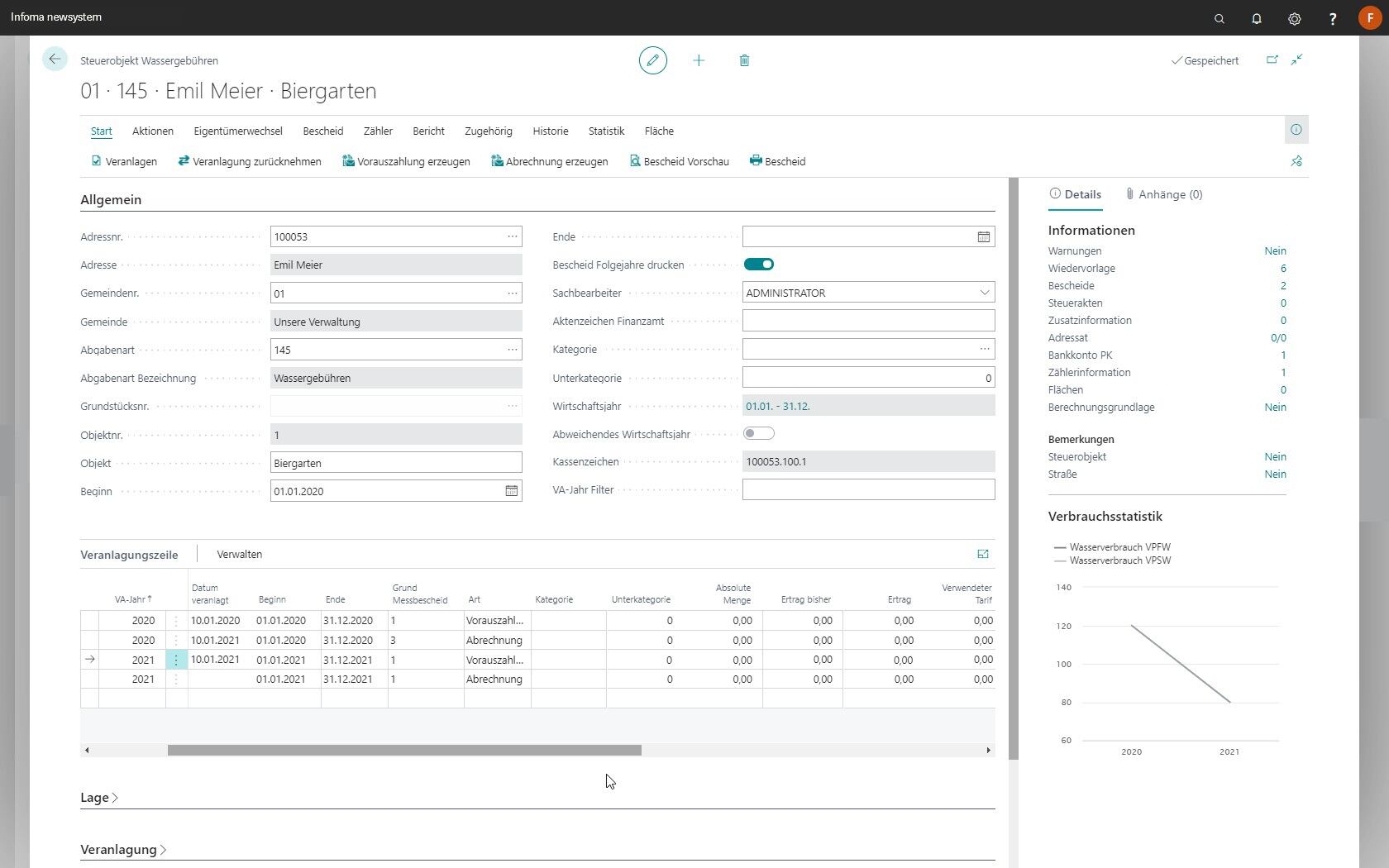 • Mit anderen Einnahmearten kombinierbare Bescheidschreibung der Verbrauchsgebühren