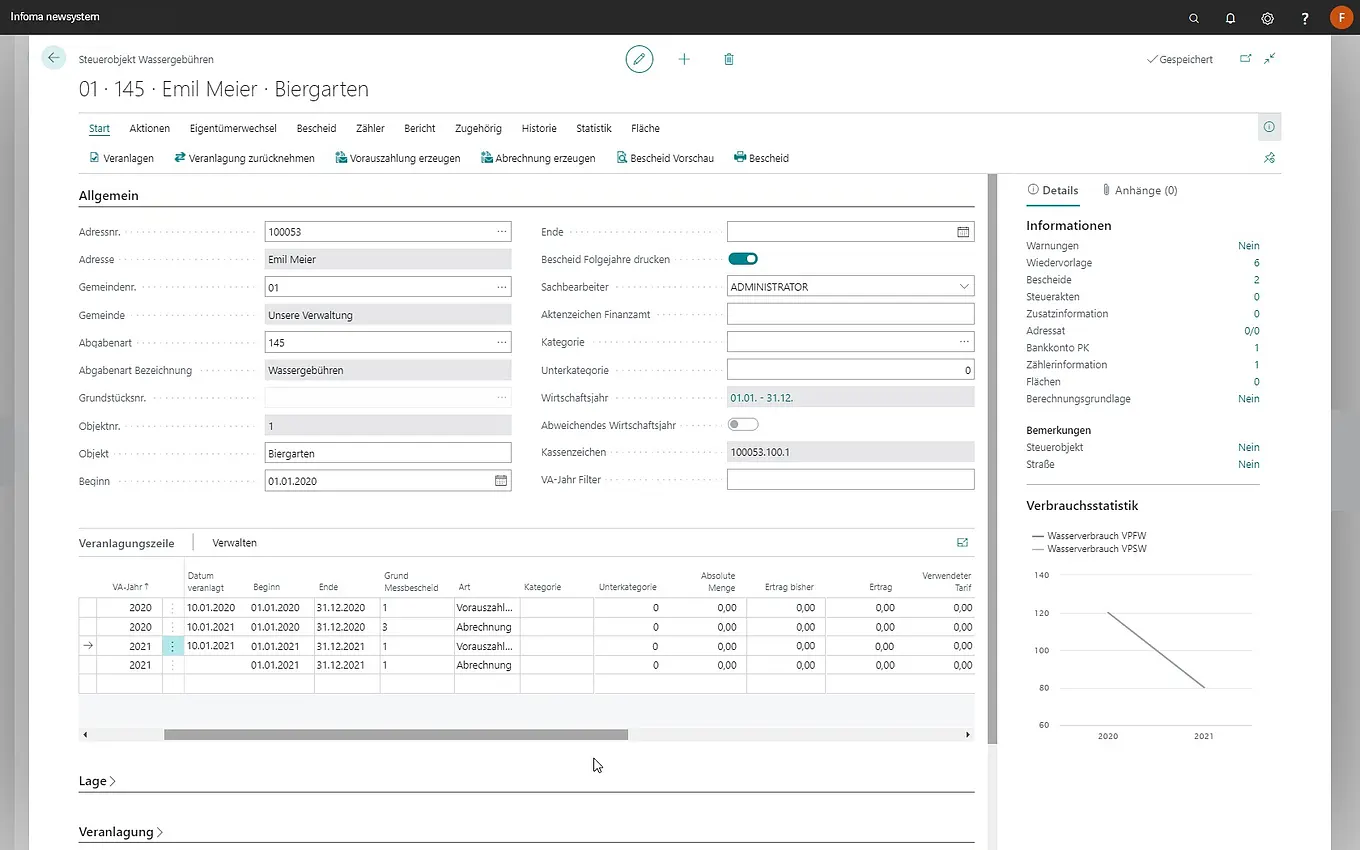 Die Verbrauchsabrechnung sorgt ergänzend zu Steuern, Gebühren und Beiträgen im Dialog mit den Bürgern dafür, dass Sie veranlagungsrelevante Informationen bei der rollierenden Abrechnung von verbrauchsabhängigen Gebühren, wie u.a. Wasser und Abfall, effizienter verarbeiten und auswerten können.
