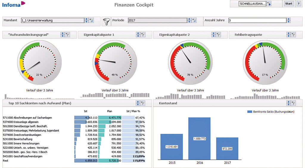 Übernimmt die systematische Sammlung, Auswertung, Veredelung und Darstellung aller in der kommunalen Verwaltung vorhandenen Finanzdaten. Bedarfsgerecht stellt es Verwaltung und Politik zum richtigen Zeitpunkt und in der gewünschten Form aus der Fülle der Daten genau die Informationen zur Verfügung, die als Grundlage wichtiger Entscheidungen benötigt werden. Funktionen für Prognosen und Forecasts unterstützen bei der wirkungsorientierten Steuerung. Für Sitzungen und Besprechungen stehen zudem alle Berichte automatisch per App zur Verfügung. Die Kombination mit dem Leistungsportfolio von IKVS ermöglicht Ihnen darüber hinaus ziel und steuerungsrelevante Kennzahlenvergleiche.