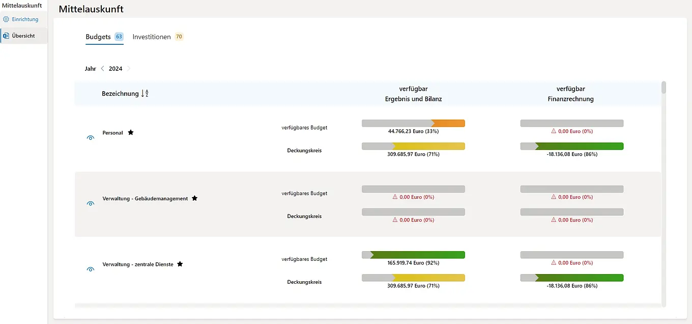 Bietet auch dezentral tätigen Mitarbeiter:innen die komfortable Möglichkeit einer einfachen und schnellen Budgetüberwachung. Dabei werden die im Budget bereits gebuchten Rechnungen sowie über- und außerplanmäßige Mittel, Reste und Mittelreservierungen für den jederzeitigen Überblick über noch verfügbare Beträge berücksichtigt. Investitionen sind ebenfalls direkt abrufbar.
