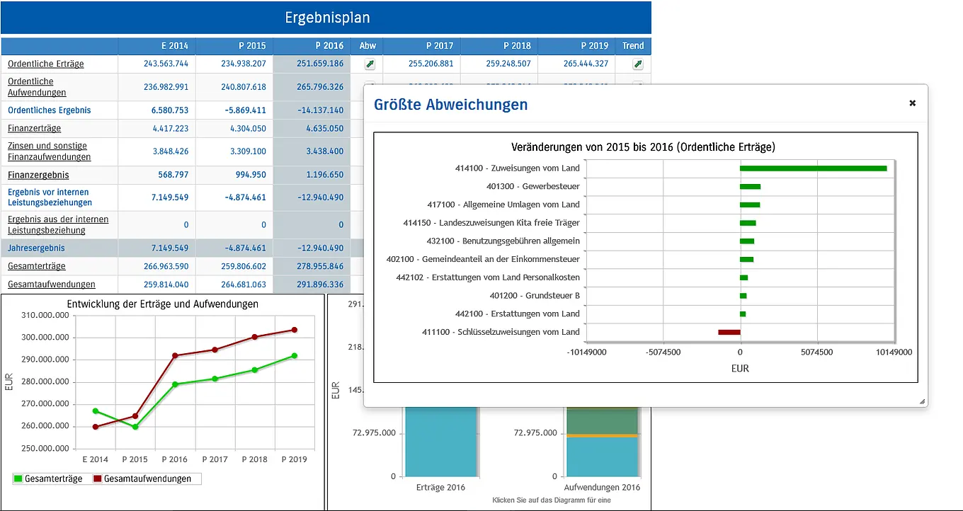 Ermöglicht Ihnen, in Kombination mit dem Leistungsportfolio des Schwesterunternehmens IKVS, den Haushalt via Internet zu präsentieren. Ohne Mehraufwand können Sie über alle Hierarchieebenen hinweg Ihre Haushaltsdaten grafisch und visuell aufbereiten. Die Erstellung der gesetzlich vorgeschriebenen Haushaltsvorberichte sowie der Lage- bzw. Rechenschaftsberichte erhalten Sie auf Knopfdruck.