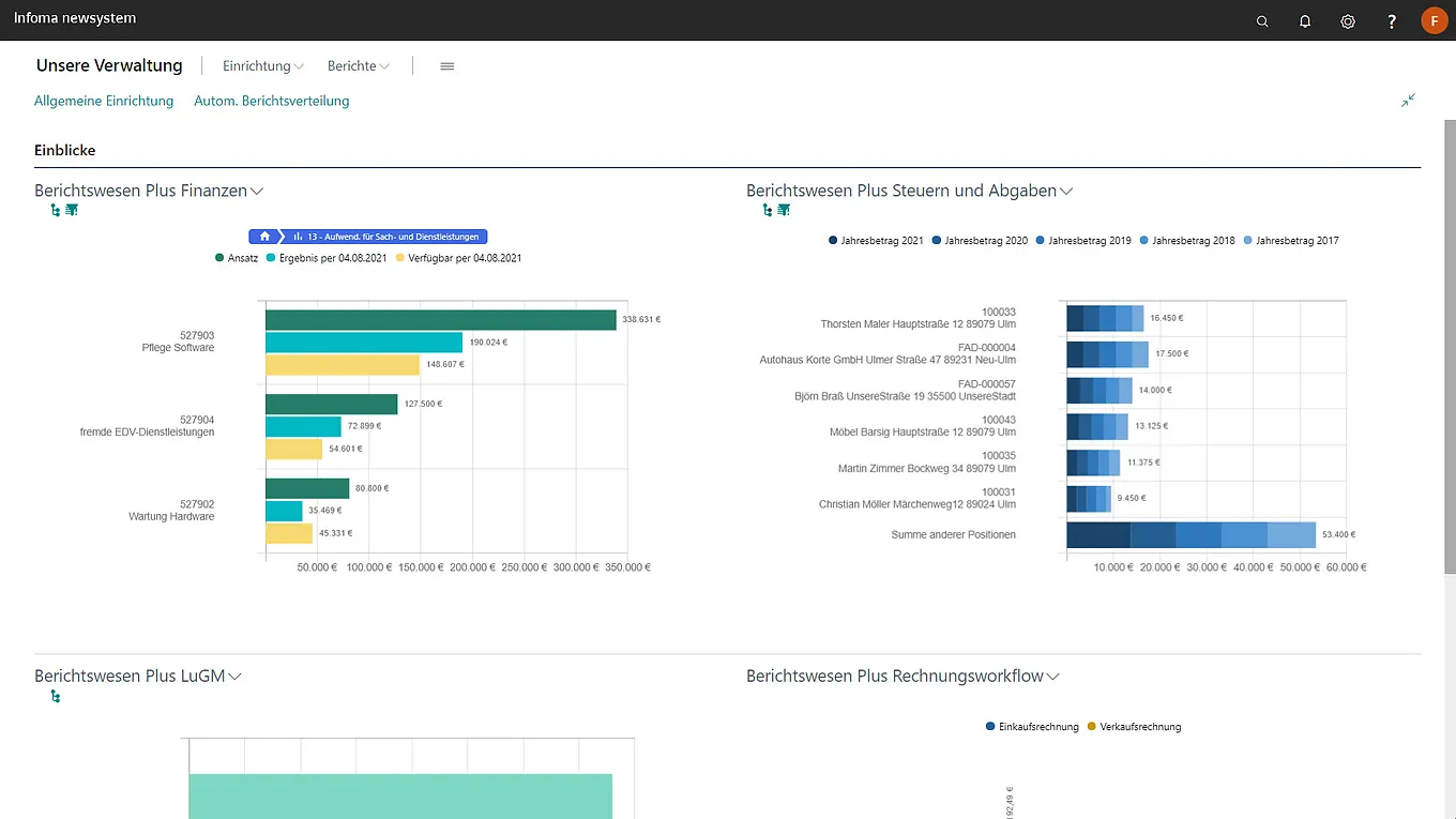 In vielen Kommunen ist ein effizientes Berichtswesen, das das gesamte Leistungsspektrum der Verwaltung im Blick behält, entscheidend. Der Aufbau kann jedoch personal- und zeitintensiv sein. Das Berichtswesen Plus von Infoma bietet hier eine effektive Lösung. Es stellt alle notwendigen Zahlen grafisch und tabellarisch in einer benutzerfreundlichen Oberfläche bereit, sodass Anwender schnell Handlungsbedarfe erkennen und sich einfach über den aktuellen Stand informieren können.