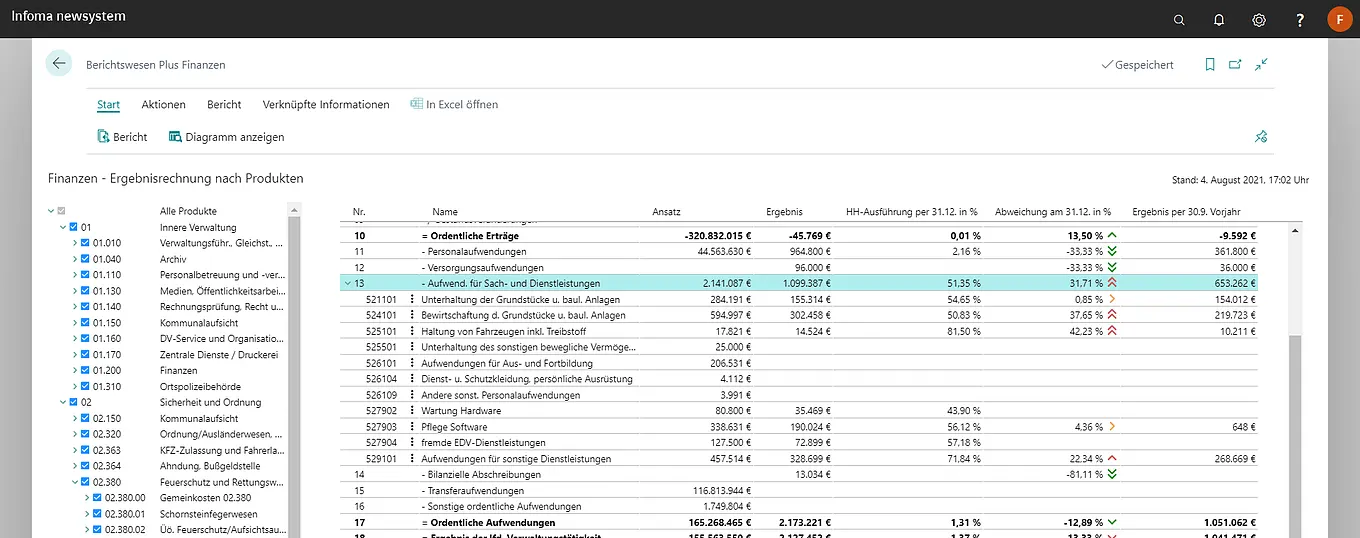 Dafür stehen umfangreiche, vordefinierte Standardberichte aus der Ergebnis- und Finanzrechnung, den Budgets und den Investitionen als Grundlage für Plan- / Ist- und Vorjahresvergleiche, Abweichungsanalysen und vieles mehr zur Verfügung. Alle Auswertungen sind dabei nahtlos in das Infoma newsystem Rollencenter integriert und dabei so einfach zu bedienen, dass sie sich für den flächendeckenden Einsatz von der Verwaltungsspitze bis zum Sachbearbeiter eignen – ganz ohne Schulungs- oder Einrichtungsaufwand.