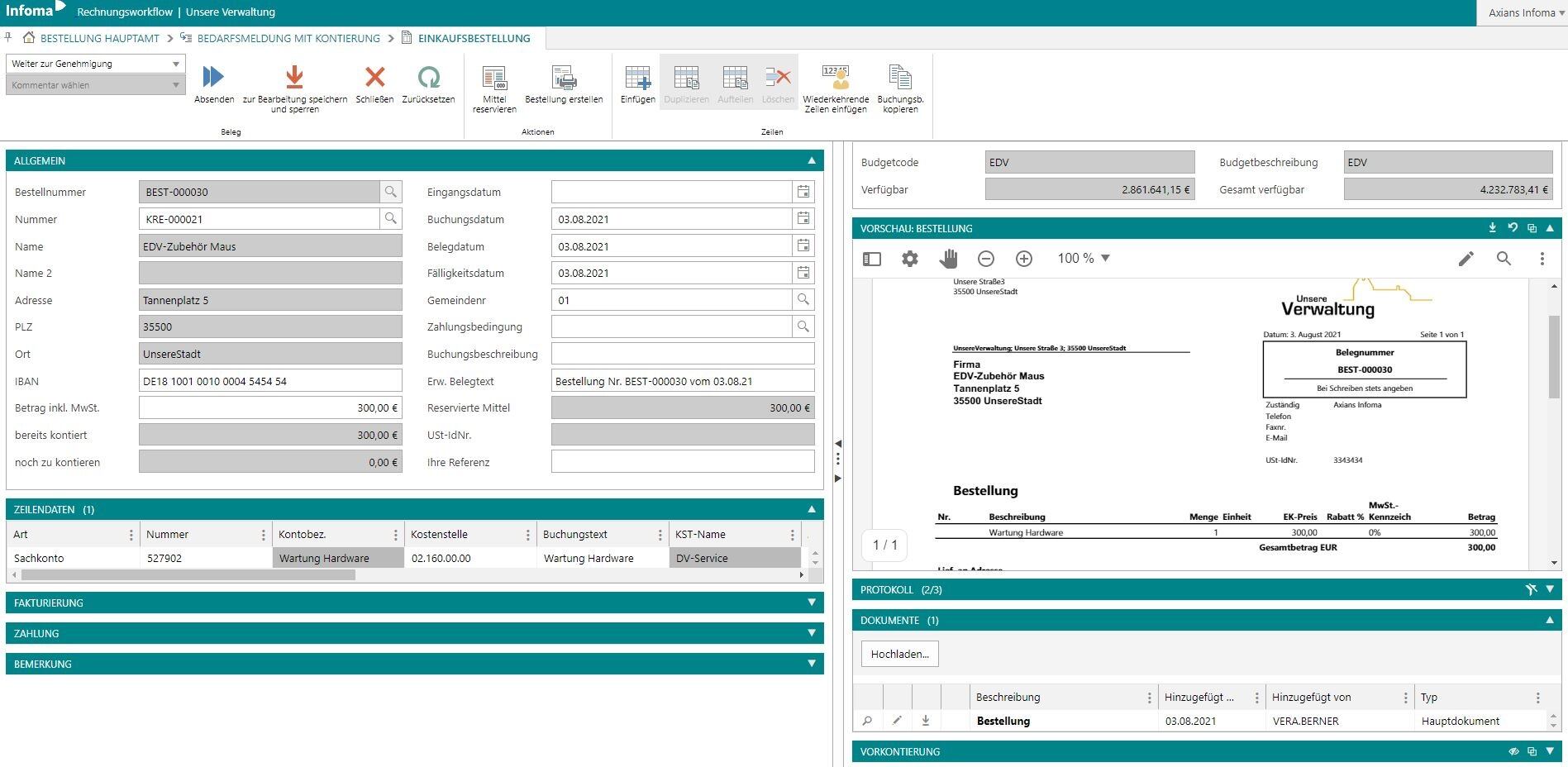 Gibt die elektronische Bedarfsmeldung mit gleichzeitiger Mittelreservierung in den Genehmigungsprozess und generiert im Anschluss eine Bestellung inkl. eines Auftragsschreibens. Der gesamte Prozess des Bestellworkflows wird digital abgebildet und ist für alle Beteiligten transparent, nachvollziehbar und schneller.