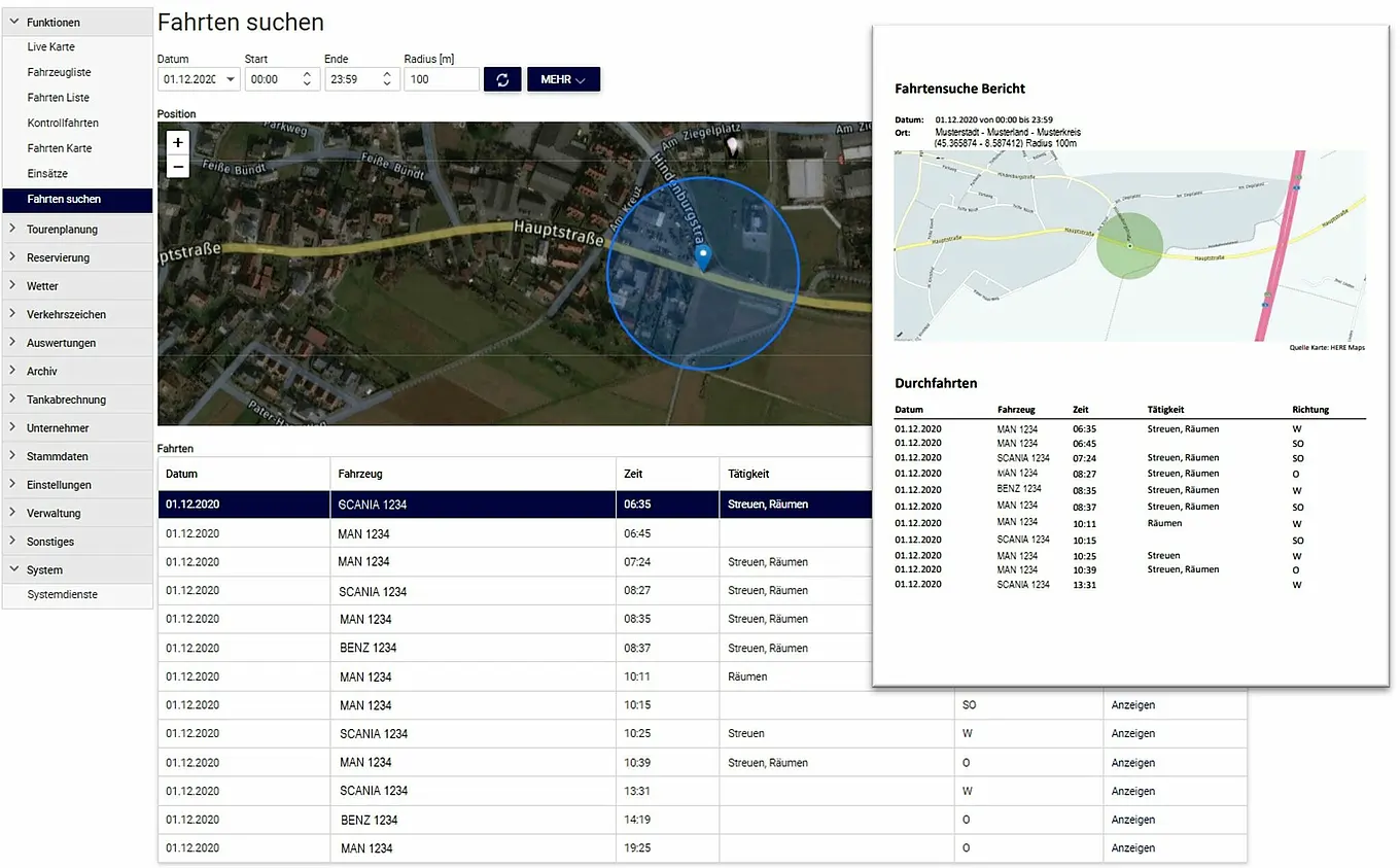 Auf Knopfdruck lässt sich beispielsweise ein detaillierter Bericht über die geleisteten Winterdiensteinsätze erstellen. Separate Winterdienstjournale sind nicht erforderlich. Alle Einsätze werden aufgezeichnet, qualitätsgesichert sowie transparent und revisionssicher archiviert (Nachweispflicht). Auswertungen über definierte Betriebsstrecken für die Betriebsbuchhaltung in unterschiedlichen Ausprägungen sind ebenso möglich wie die Analyse einzelner Fahrten für Schulungszwecke oder Routenoptimierungen.