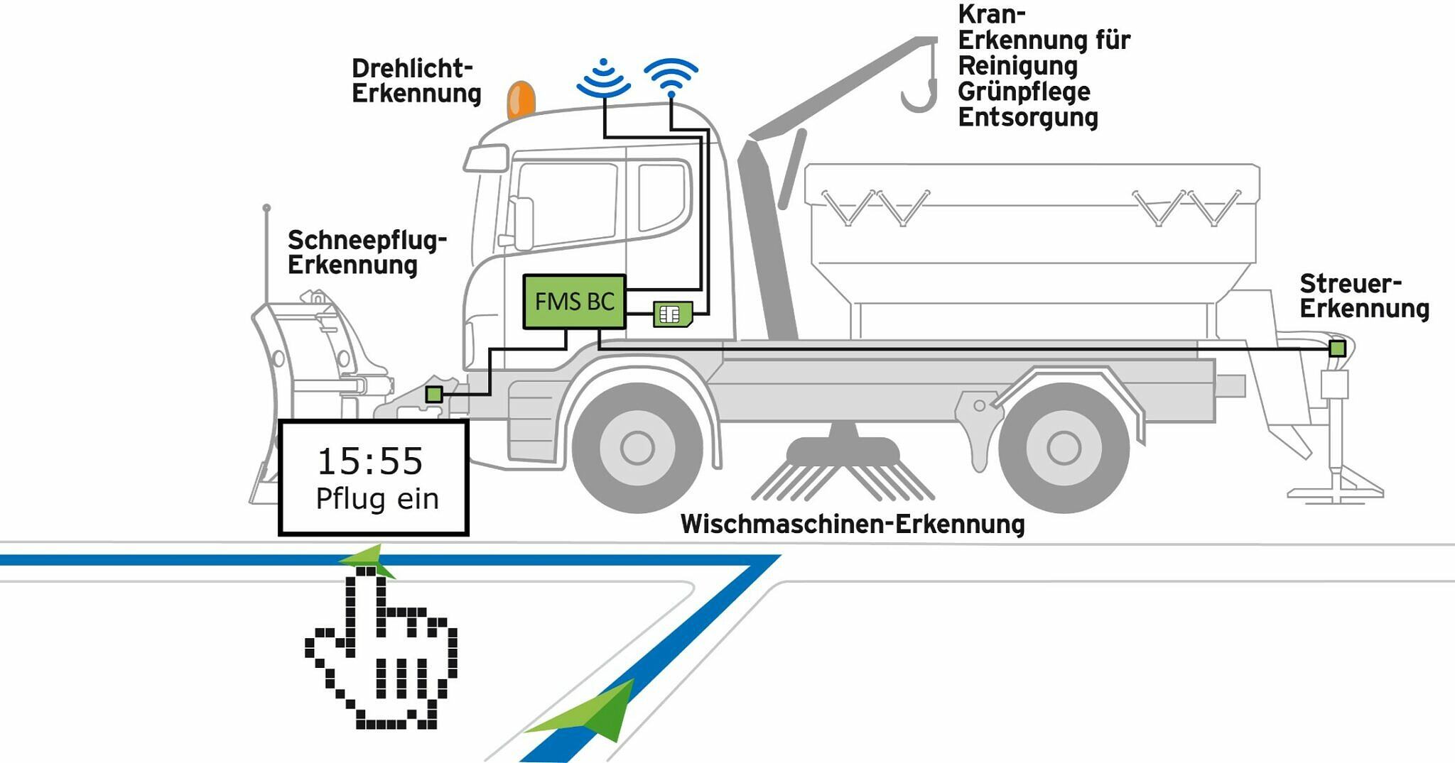 Die Komplettlösung eignet sich vor allem für Großfahrzeuge. Dabei zeichnen die Bordcomputer nicht nur gefahrene Kilometer auf, sondern auch zahlreiche Details. Dazu gehören Streubreite, Streumenge und der Einsatz anderer Geräte, wie beispielsweise Pflüge, Kranen, Drehlichter, Bestandteile von Kehrmaschinen oder Temperatursensoren, Fahrtenvideos und vieles mehr. Jeder Bordrechner wird für das Fahrzeug und dessen Geräte maßgeschneidert programmiert. Somit steht für jeden Fahrzeugtyp die passende Lösung zur Verfügung – und die Verwaltung des kompletten Fuhrparks kann automatisiert werden.