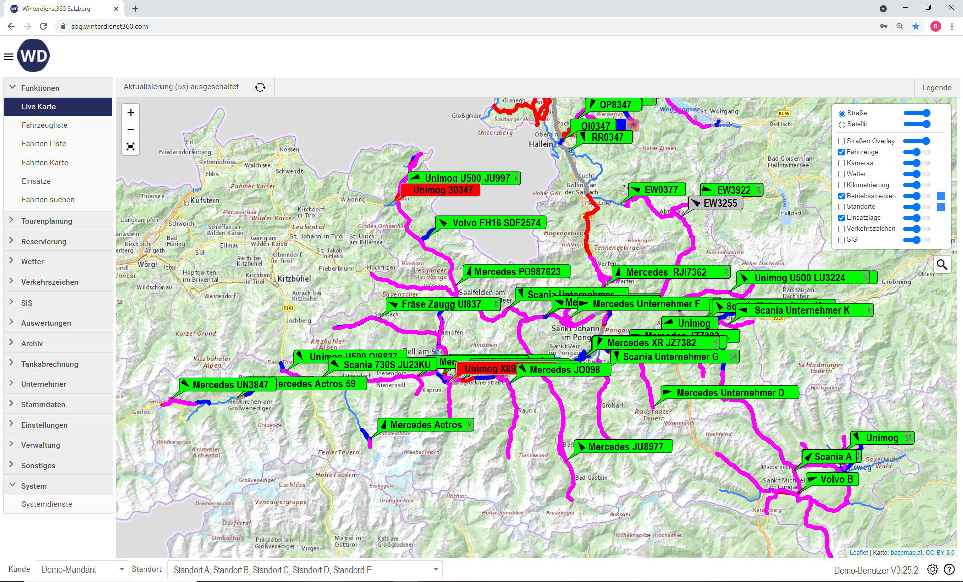 Es stehen folgende Funktionalitäten zur Verfügung: Elektronisches Fahrtenbuch, Abrechnung von Einsätzen, Nachweis von Winterdienstarbeiten, Routen aufzeichnen und abspielen sowie Salzmanagement.