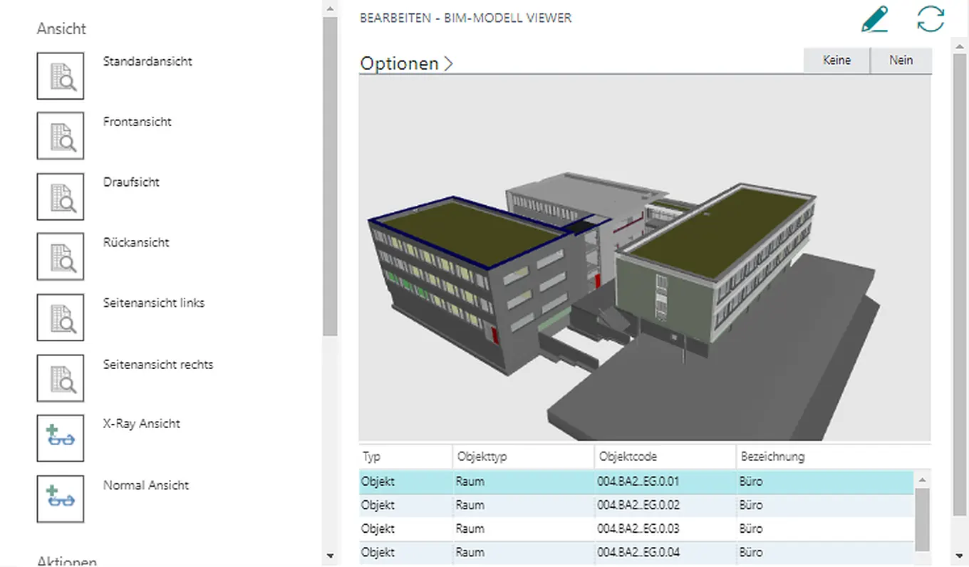 Ermöglicht im Prozess der Instandhaltung, Wartung und Prüfung die Verarbeitung und Übernahme von Modelldaten (Building Information Modeling, kurz: BIM). Die dreidimensionale Darstellung, z. B. von Räumlichkeiten und deren Flächen über Türen mit Feststelleinrichtung bis hin zu Aufzugsanlagen, erfolgt im System.