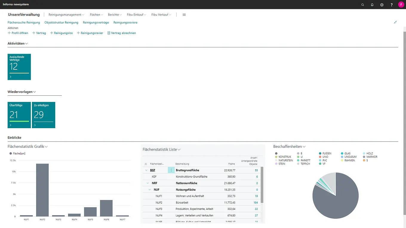 Dafür werden Reinigungsflächen definiert und mit entsprechenden Attributen versehen, Reinigungsgruppen, Leistungskategorien und Los- bzw. Revierzugehörigkeit pro Fläche hinterlegt. Das so entstandene exakte Leistungsverzeichnis ist für Reinigungsausschreibungen nutzbar. Bei der Glasreinigung können die vorhandenen Flächen beispielsweise zusammen oder getrennt nach Glas- und/oder Rahmenfläche abgebildet werden. Flächen der Unterhaltsreinigung lassen sich beliebig nach Bodenbeschaffenheiten und Flächennutzungsarten organisieren, bearbeiten und auswerten. Auch im Bereich der Eigenreinigung ist eine flexible Definition der Reinigungsreviere mit Zuordnung der eigenen Reinigungskräfte möglich. Dadurch werden die Prozesse rund um das Reinigungsmanagement digital unterstützt und vereinfacht.