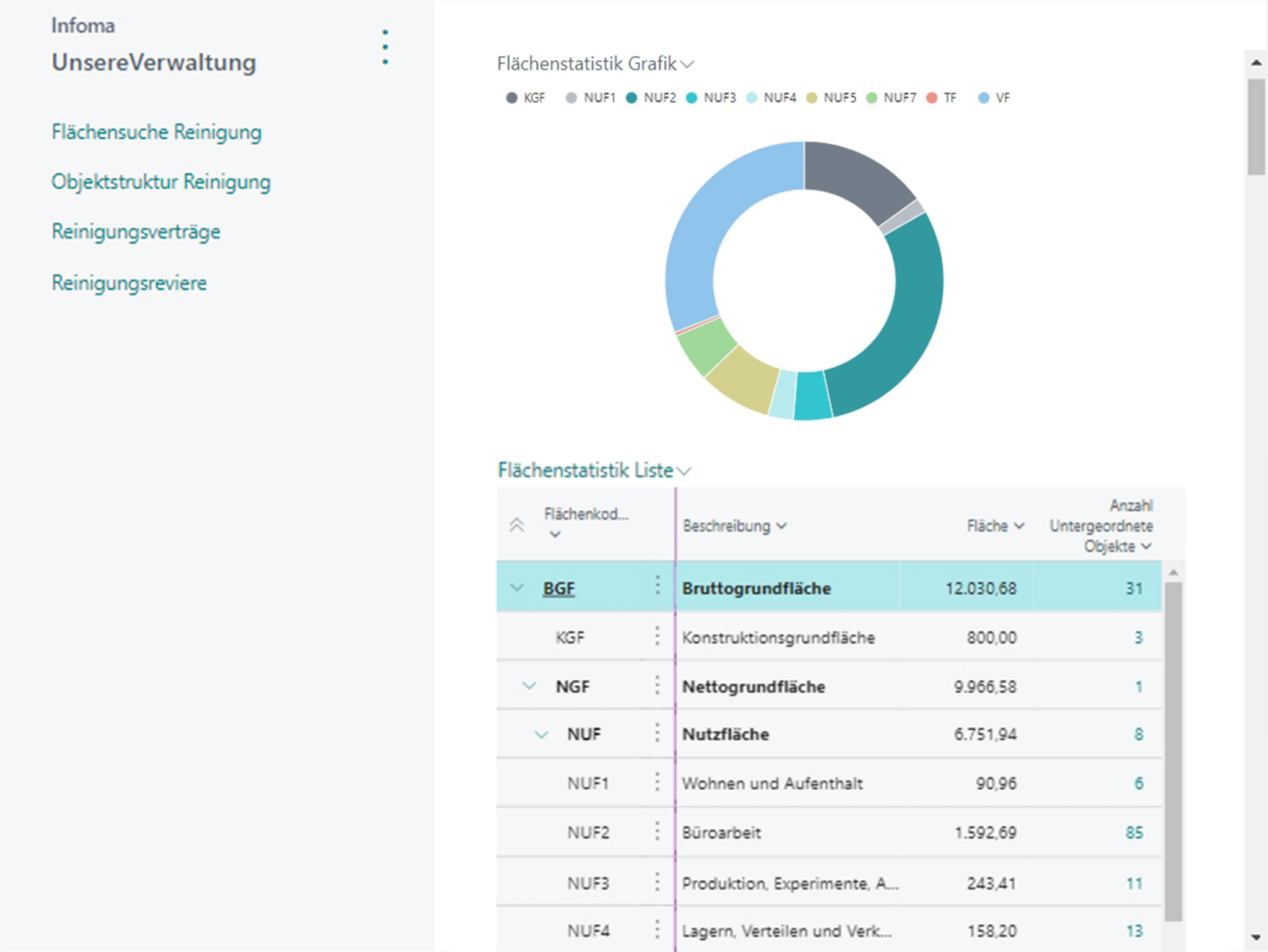 Dafür werden Reinigungsflächen definiert und mit entsprechenden Attributen versehen, Reinigungsgruppen, Leistungskategorien und Los- bzw. Revierzugehörigkeit pro Fläche hinterlegt. Das so entstandene exakte Leistungsverzeichnis ist für Reinigungsausschreibungen nutzbar. Bei der Glasreinigung können die vorhandenen Flächen beispielsweise zusammen oder getrennt nach Glas- und/oder Rahmenfläche abgebildet werden. Flächen der Unterhaltsreinigung lassen sich beliebig nach Bodenbeschaffenheiten und Flächennutzungsarten organisieren, bearbeiten und auswerten. Auch im Bereich der Eigenreinigung ist eine flexible Definition der Reinigungsreviere mit Zuordnung der eigenen Reinigungskräfte möglich. Dadurch werden die Prozesse rund um das Reinigungsmanagement digital unterstützt und vereinfacht.