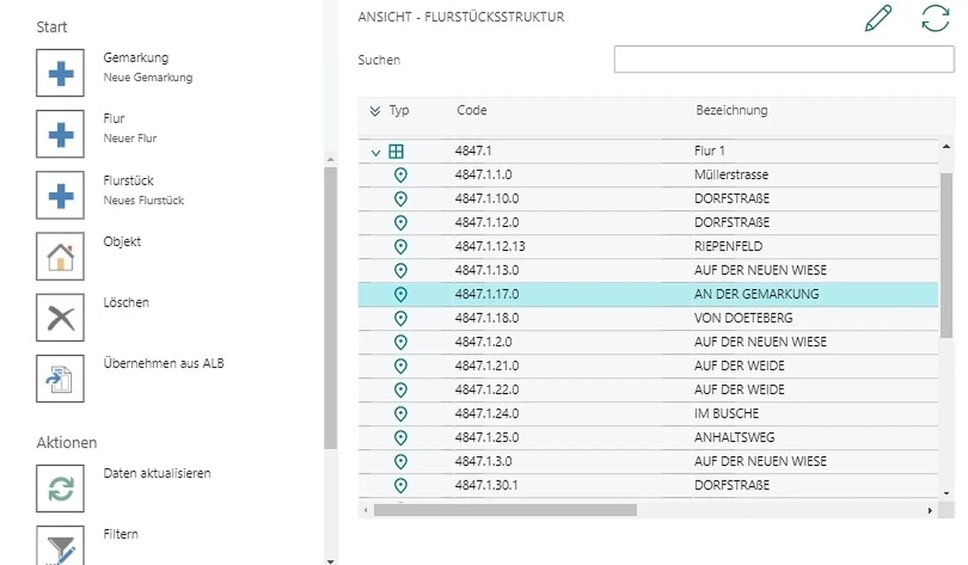 Die Basis bilden die selbst angelegten und/oder über Schnittstellen von den amtlichen Stellen (ALB/ALKIS) importierten Stammdaten der Gemarkungen, Flure und Flurstücke im Liegenschaftskatastermanagement. Dadurch lässt sich die Planung einer Flächenbebauung, aber auch die Ermittlung der momentanen Erträge (z. B. Pachten, Erbbaurechte) und Belastungen eines Grundstücks abbilden. Die anfallenden Einnahmen, z. B. aus Verpachtung, können sowohl über die Integration in die Finanzbuchhaltung als auch per Anbindung an ein beliebiges externes Finanzwesen verbucht werden. Über den Grundstücksverkehr erfolgt die digitale Abbildung der Grundstücksan- und -verkäufe im System. Die Verträge können direkt mit dem Flurstück verknüpft werden. Auch die Abbildung und Historisierung der Teilung und Zusammenführung von Flurstücken oder Flurstückanteilen ist möglich. Bei bebauten Flurstücken erfolgt die Verknüpfung der Gebäude mit dem Flurstück. Suchfunktionen mit einer Vielzahl von Filtermöglichkeiten unterstützen die Mitarbeitenden beim schnellen Auffinden von z. B. Verträgen und Flurstücken. Diese Funktionalitäten sorgen für eine digitale und transparente Verwaltung der Grundstücksgeschäfte.