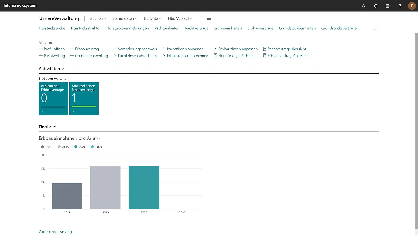 Bildet die Erbpachtverträge sowie die damit in Verbindung stehenden Prozesse ab. Es werden Vorschlagslisten zu Erbbauzinsanpassungen generiert. Dabei werden die Anwendenden durch die Billigkeitsprüfung nach §9a ErbbauRG optimal unterstützt. Verträge und weiterer Schriftverkehr können über das System in Microsoft Word erzeugt werden.