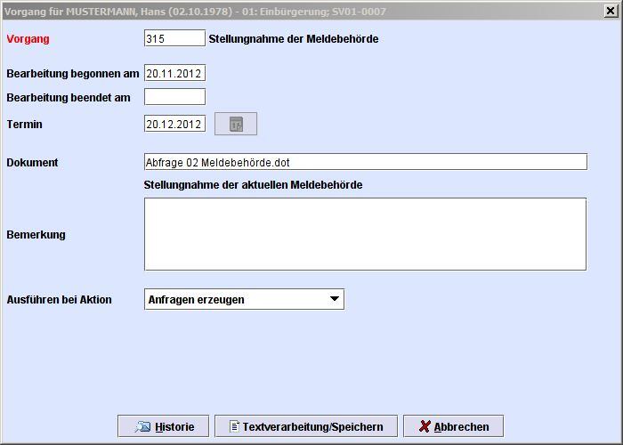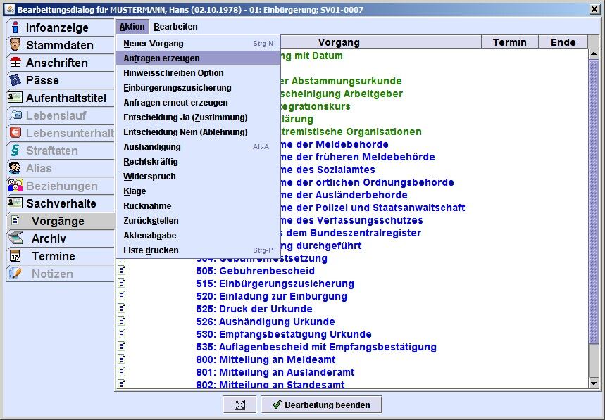 Einen besonderen Mehrwert bieten Ihnen unsere Lösungen durch die umfangreiche Unterstützung Ihrer Sachbearbeitung mit verschiedenen Workflows. Z.B. werden innerhalb der Abläufe notwendige Dokumente automatisch von der angebundenen Textverarbeitungssoftware Microsoft Word erzeugt und direkt in den Verfahren abgelegt. Das erleichtert den Schriftverkehr mit dem Bürger und allen weiteren Behörden. Wichtige Informationen, wie z.B. Staatenschlüssel, Ausländer- und Einbürgerungsbehörden, sind in beiden Verfahren hinterlegt. Umfangreiche Plausibilitätsprüfungen sowie flexible und weitgehend frei zu vergebende Parameter sorgen für sichere Arbeitsabläufe.