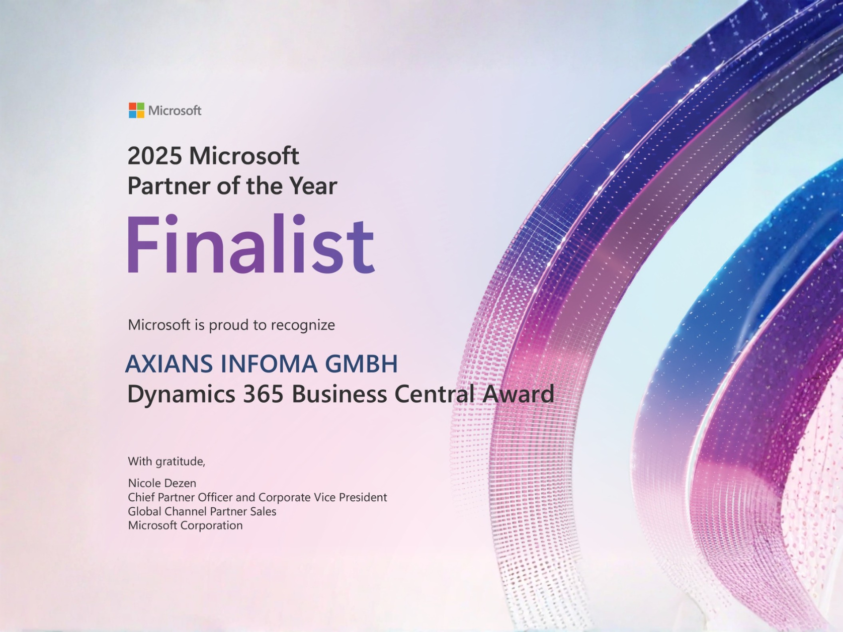 Axians Infoma hat die Auszeichnung als Finalist für den „Dynamics 365 Business Central 2025 Microsoft Partner of the Year Award” erhalten. Das Unternehmen wurde unter den weltweit führenden Microsoft-Partnern für seine Innovationskraft und seine herausragenden Leistungen hinsichtlich der Implementierung von Kundenlösungen auf Basis von Microsoft-Technologie ausgezeichnet.