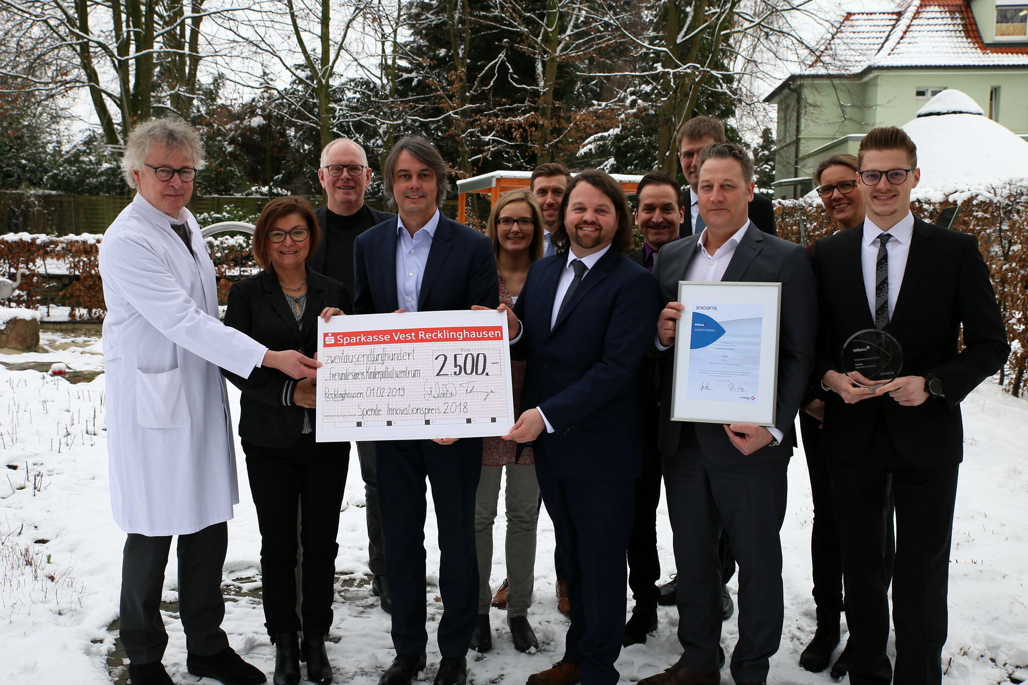 Bildunterschrift: Persönliche Übergabe des Axians Infoma Innovationspreises 2018 beim Finalist Kreis Recklinghausen v.l.n.r.: Prof. Boris Zernikow (Kinderpalliativzentrum Vestische Kinder- und Jugendklinik Datteln), Barbara Gertz (Freundeskreis Kinderpalliativzentrum Datteln), Landrat Cay Süberkrüb (Kreis Recklinghausen), Oliver Couvigny (Axians Infoma), Katharina Maaßen (Kinderpalliativzentrum Vestische Kinder- und Jugendklinik Datteln), Karl Chat (GKD Recklinghausen), Jens Fekonja (Kreis Recklinghausen), Dr. André Jethon (Kreis Recklinghausen), Sören Kuhn (GKD Recklinghausen), Kai Eickmeier (Axians Infoma), Nicole Sasse (Freundeskreis Kinderpalliativzentrum Datteln), Kevin van Holt (Kreis Recklinghausen).